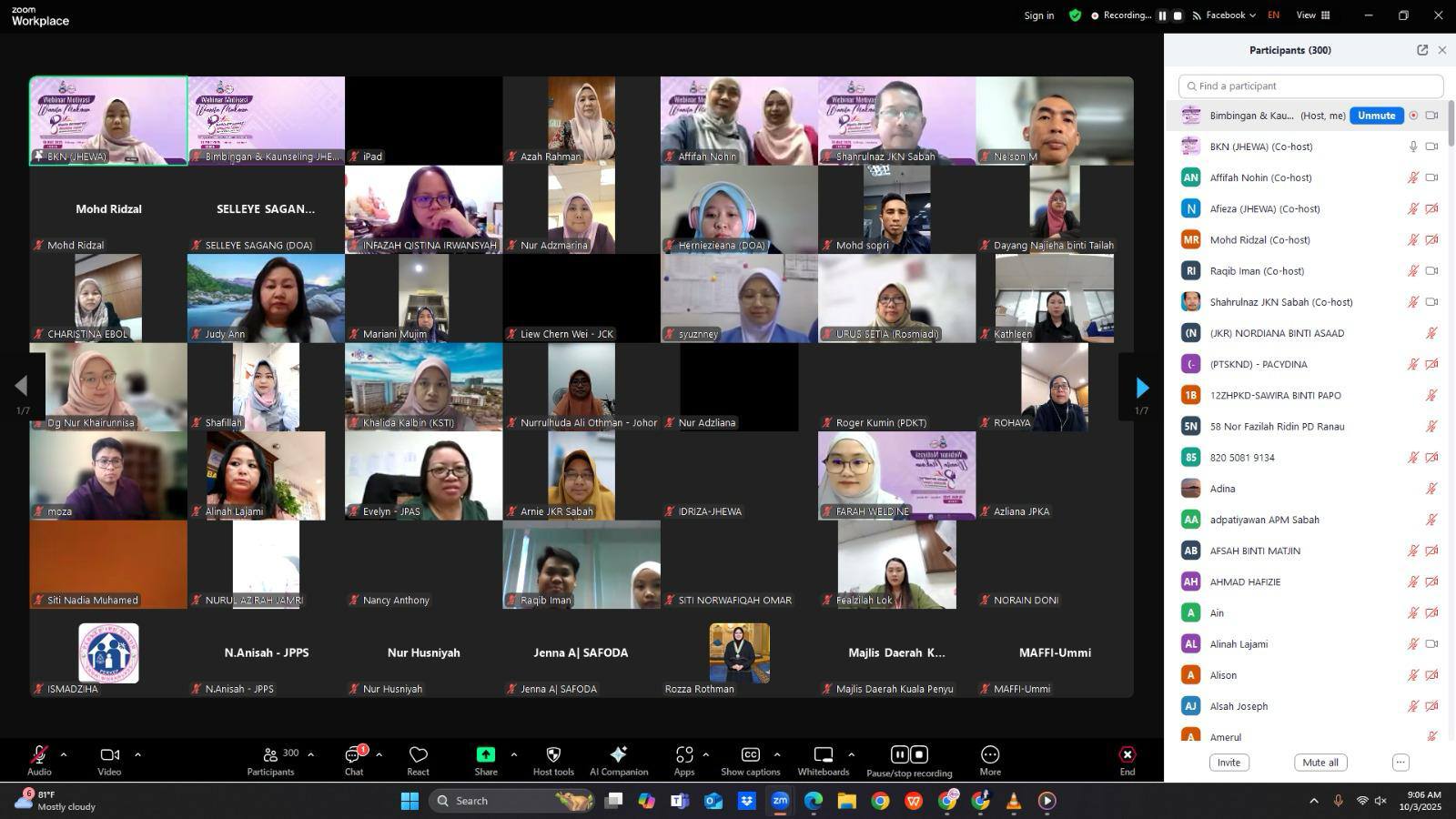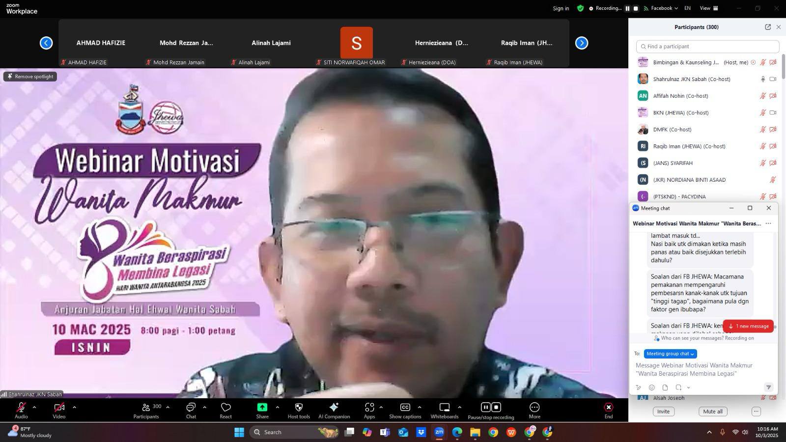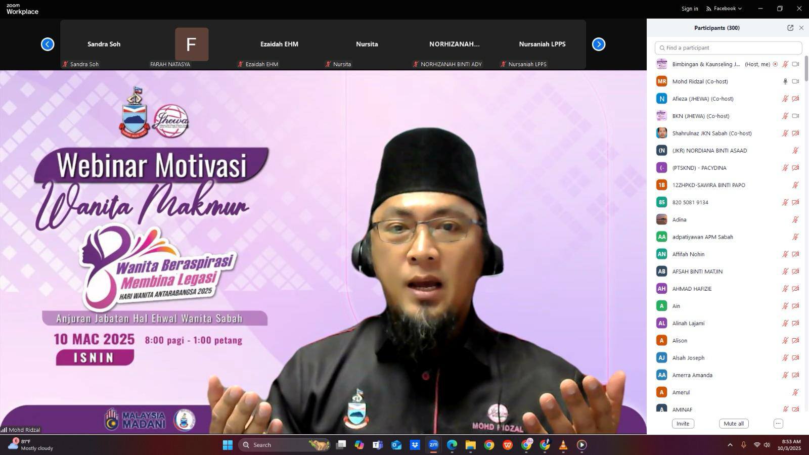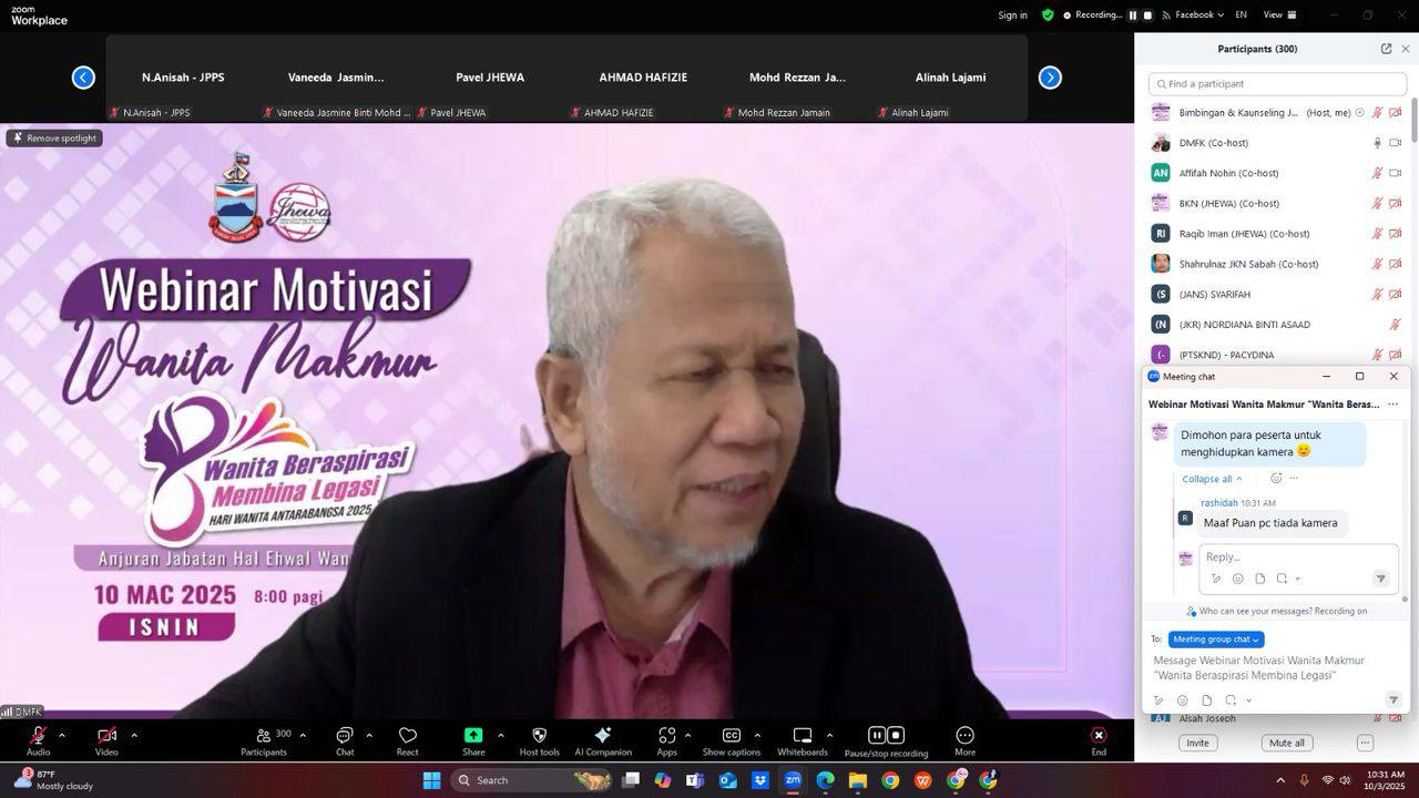 Kota Kinabalu, 10 Mac 2025 – Jabatan Hal Ehwal Wanita Sabah (JHEWA) telah berjaya menganjurkan webinar Motivasi Wanita Makmur bertemakan "Wanita Beraspirasi Membina Legasi" sempena Hari Wanita Antarabangsa 2025. Program yang diadakan dalam talian melalui aplikasi Zoom dan Facebook Live ini dirasmikan oleh YBhg. Puan Hajah Haslina Ismail, Pengarah JHEWA.