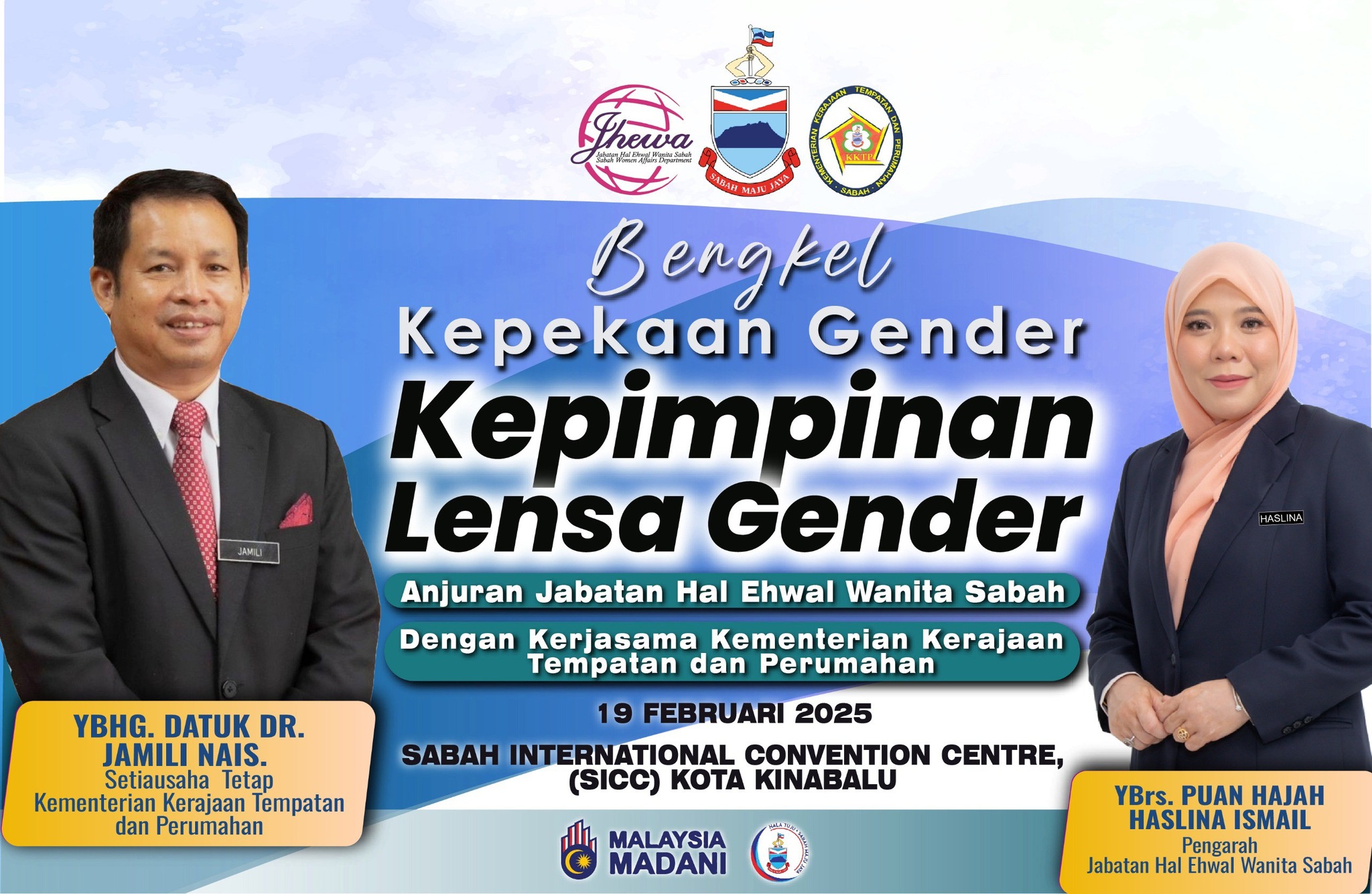 SICC, 19 Februari 2025 – Jabatan Hal Ehwal Wanita Sabah dengan kerjasama Kementerian Kerajaan Tempatan dan Perumahan menganjurkan Bengkel Kepekaan Gender bertajuk "Kepimpinan Lensa Gender" di Manukan Room, SICC, dengan penyertaan 50 pegawai awam negeri. Program ini bertujuan untuk meningkatkan kesedaran dan pemahaman tentang isu-isu gender dalam konteks kepimpinan.