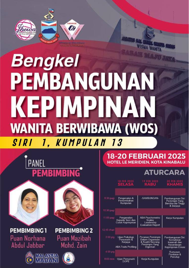 Kota Kinabalu, 20 Februari 2025 – Bengkel Pembangunan Kepimpinan Wanita Siri 1 telah diadakan dengan jayanya di Le Meridien Kota Kinabalu dari 18 hingga 20 Februari 2025, melibatkan 30 pegawai perkhidmatan awam negeri Gred 41dan (ke atas) yang merupakan wanita berpotensi dalam pelbagai bidang.
