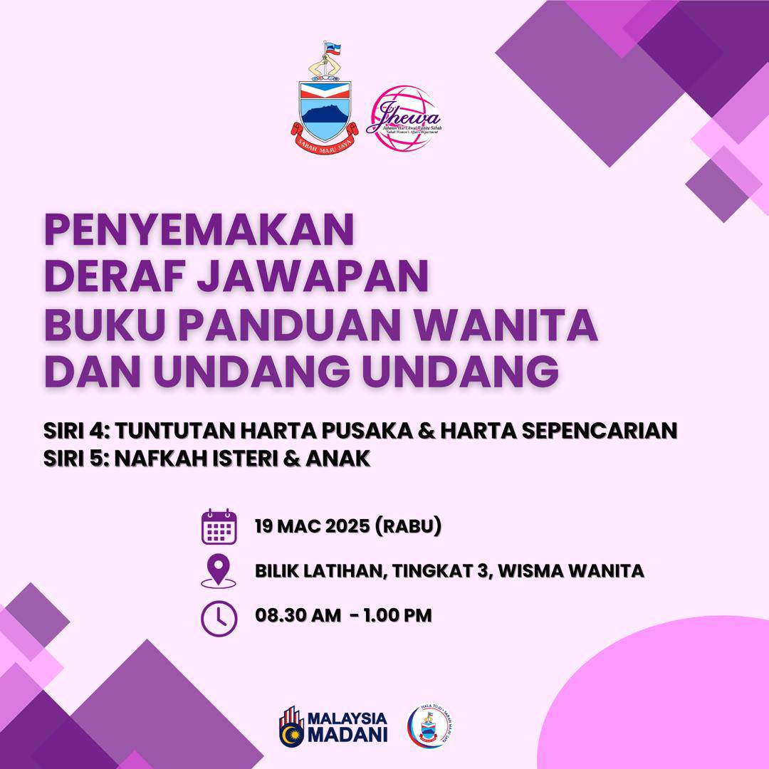 Satu sesi penyemakan deraf jawapan bagi Buku Panduan Wanita Dan Undang-Undang telah berlangsung dengan jayanya pada 19 Mac 2025 (Rabu). Sesi ini melibatkan perbincangan mengenai Siri 4: Tuntutan Harta Pusaka & Harta Sepencarian serta Siri 5: Nafkah Isteri Dan Anak.
